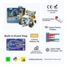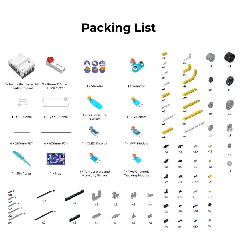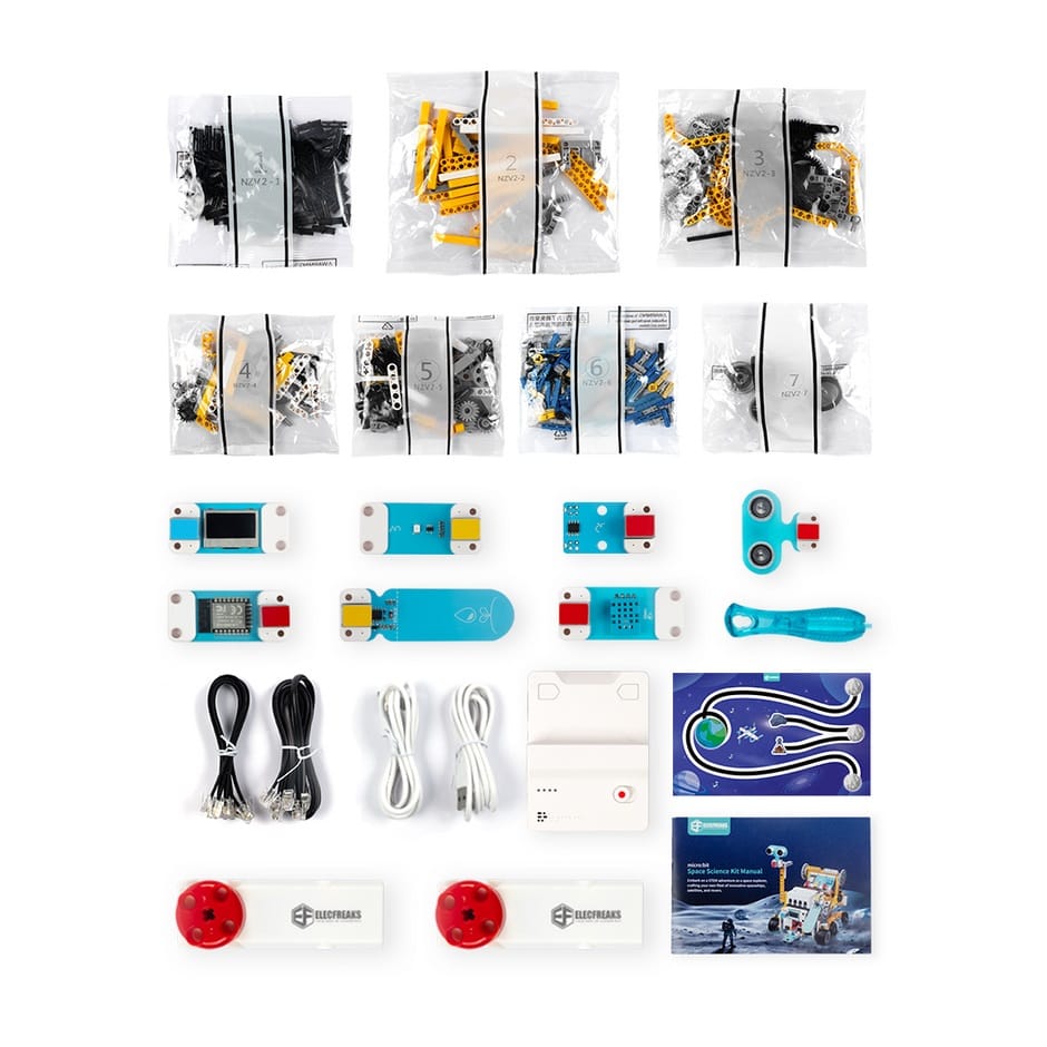 The micro:bit Space Science Kit is a STEAM education kit for elementary and middle school students. The kit uses the Nezha breakout board V2, the PlanetX Smart Motor, a variety of PlanetX sensors, a scenario-based map of the moon landing plan, and several building blocks to allow students to build projects and realize simulation missions on the moon.
